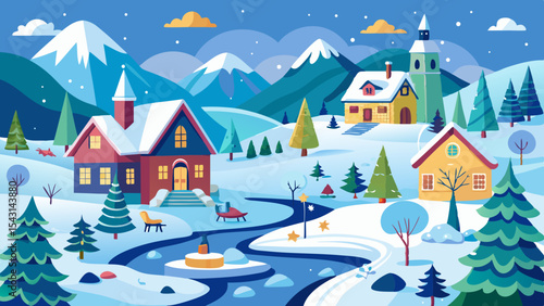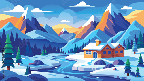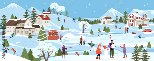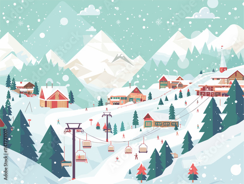 Ski areál s lyžaři, lanovkami, vleky, vektorové ilustrace. Zimní dovolená a sportovní aktivity. Zimní sezóna Horská krajina s Alpami chata. Horské lyže, snowboard, sjezdové tratě.