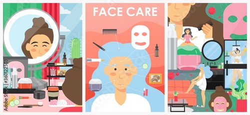 Péče o pleť a krása vektorové plakát banner šablony set. Péče o obličej hygienické postupy a ošetření. Škola make-upu, kosmetické kurzy, služby kosmetického salonu, rutina domácí péče o pleť.