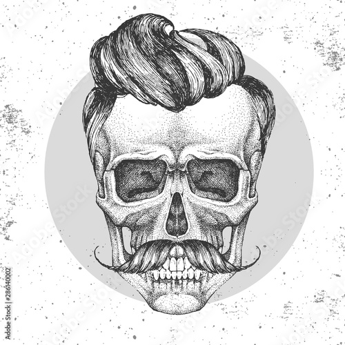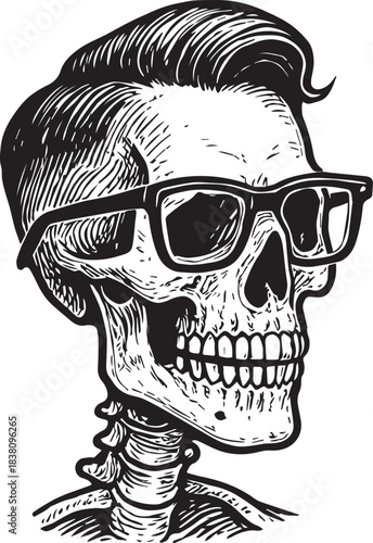 Vektorové ilustrace lidské lebky v brýlích s knírem a vousy při poslechu hudby. Lebka Hudba hipster vintage grunge design pro tričko nebo tisk.