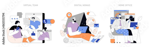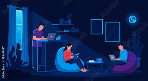 Manželský pár ležící v posteli se odvrátil od sebe, ploché vektorové ilustrace. Bezesná žena pomocí smartphonu trpí nespavostí. Stres, deprese, závislost na smartphonu, porucha spánku.