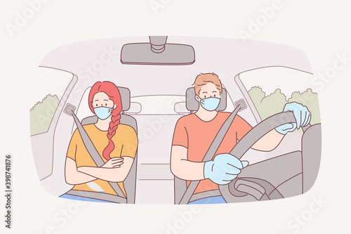 Ospalá dívka řízení auta, ploché vektorové ilustrace. Unavená řidička kreslená postavička, ospalá mladá žena s šálkem kávy za volantem.