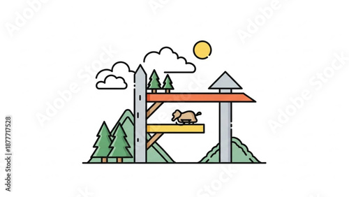 Vektorová ilustrace holčičky klouzající po skluzavce na hřišti. Slide concept designový prvek v plochém stylu.
