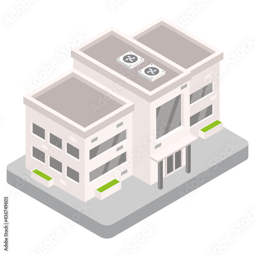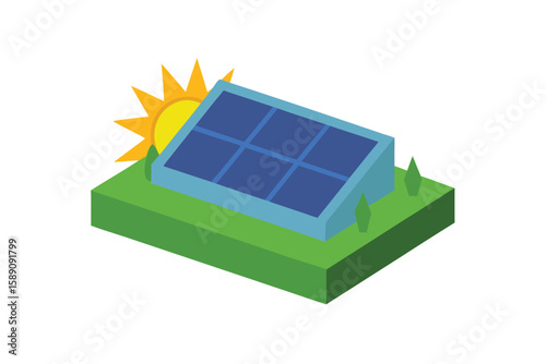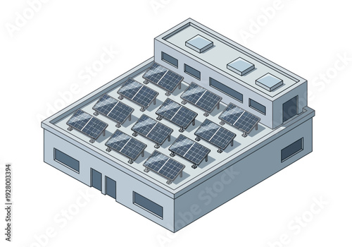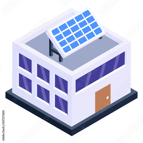 Smart grid City energy solární elektrárna vektorové ikony. Izometrická budova s fotovoltaickým panelem pro udržitelnou výrobu zelené elektřiny 3D ilustrace