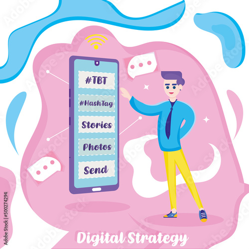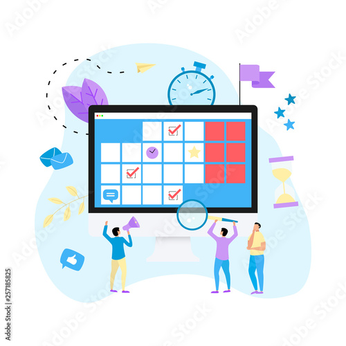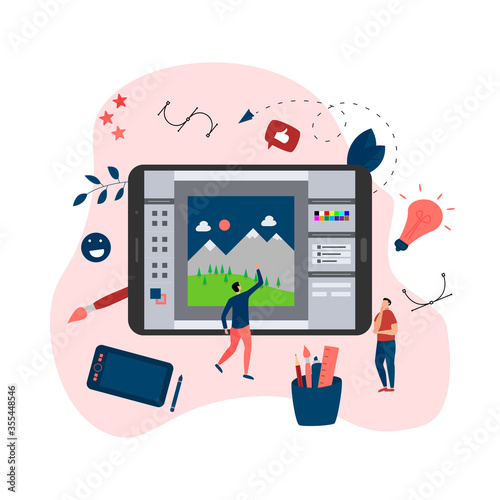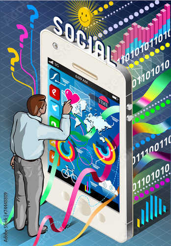 Obrovský Mobilní telefon s inteligentními domácími aplikacemi pro domácí automatizaci, mikro mužské a ženské postavy, vektorové ilustrace. Internet věcí ovládání osvětlení, topení, větrání, zabezpečovací systémy.