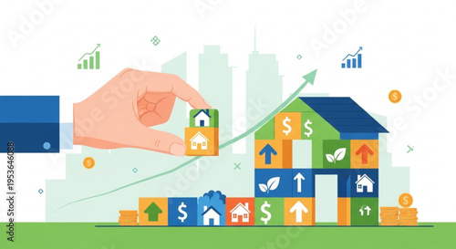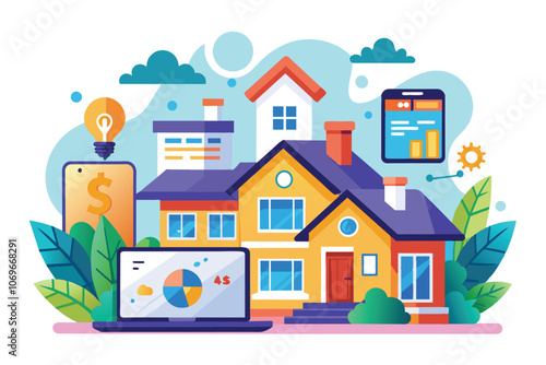 Vektorový diagram inteligentního domu. Dům s dálkově ovládaným zabezpečením domácnosti, osvětlením, větracími systémy a dalšími chytrými zařízeními. Plochý design.