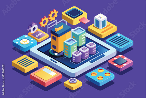 Inteligentní ekologické zemědělství infographic. Farmář spravuje svou průmyslovou farmu pomocí aplikace pro chytré telefony, ploché vektorové izometrické ilustrace. Čistá energie. Iot, ai, drony, robotické technologie v zemědělství.