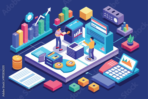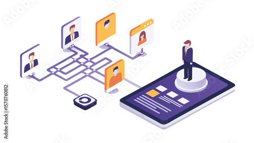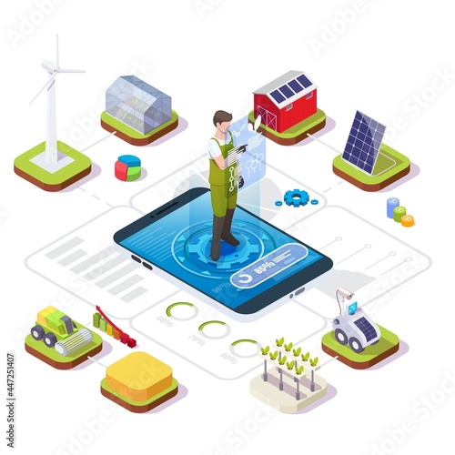 Inteligentní ekologické zemědělství infographic. Farmář spravuje svou průmyslovou farmu pomocí aplikace pro chytré telefony, ploché vektorové izometrické ilustrace. Čistá energie. Iot, ai, drony, robotické technologie v zemědělství.