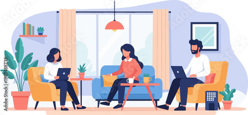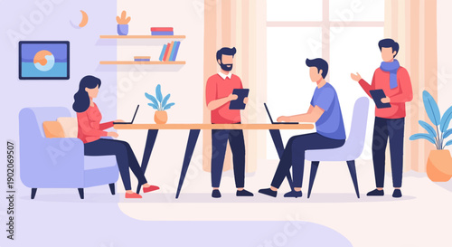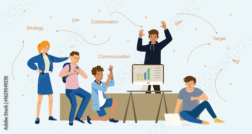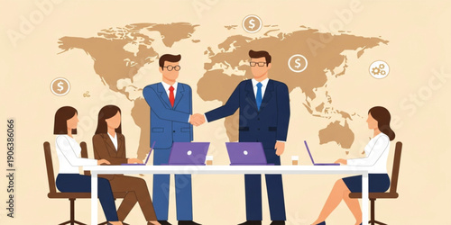 Podnikatelé pozdrav inteligentní robot stroj v kanceláři. AI a lidé pracují společně, ploché vektorové ilustrace. Umělá inteligence a lidská spolupráce, spolupráce.