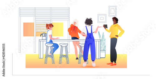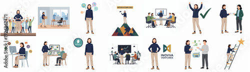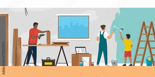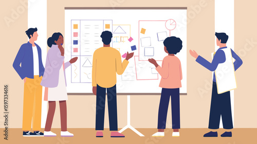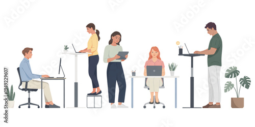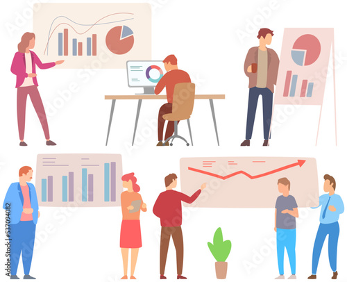 Podnikatelé pozdrav inteligentní robot stroj v kanceláři. AI a lidé pracují společně, ploché vektorové ilustrace. Umělá inteligence a lidská spolupráce, spolupráce.