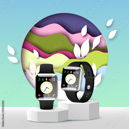 Prezentace chytrých hodinek. Vektorové 3D nositelné náramkové hodinky na pódiu přes papercut barevné pozadí reklama design šablony. Výstava elektronických náramků