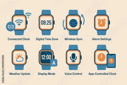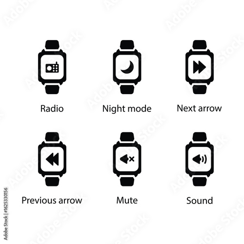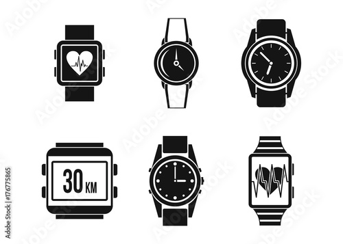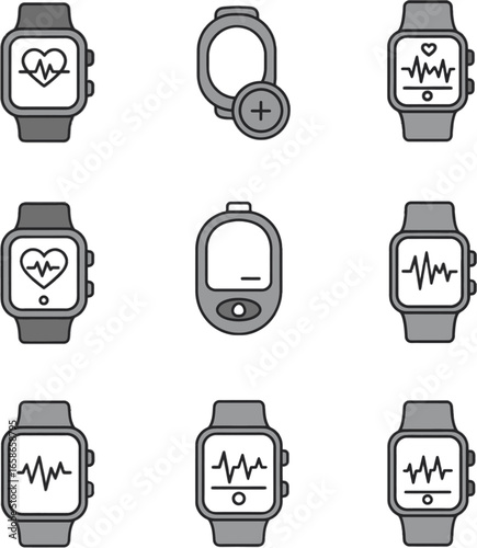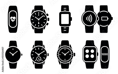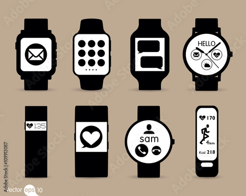 Chytré hodinky realistický vektor. Náramkové nositelné hodiny se sadou rozhraní dotykového displeje. Ruční zařízení pro sledování indikátorů zdraví, času a sportu. Smartwatch příslušenství 3D ilustrace