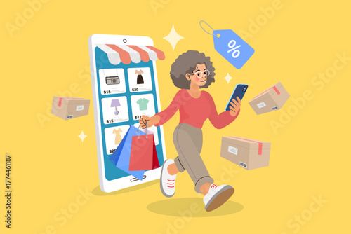 Bonus za Smartphone, odměna za poukaz, dárková reklama na doporučení. Šťastná žena zákazník ukazuje obrazovku mobilního telefonu s nákupním programem a cenou za nákup vektorové ilustrace