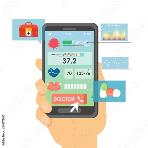 Ruční chytrý telefon s lékařskou aplikací na obrazovce, vektorová plochá ilustrace. Konzultace s lékařem, krevní tlak, srdeční frekvence, kontrola tělesné teploty mobilní zdraví, aplikace pro lékařské testování.