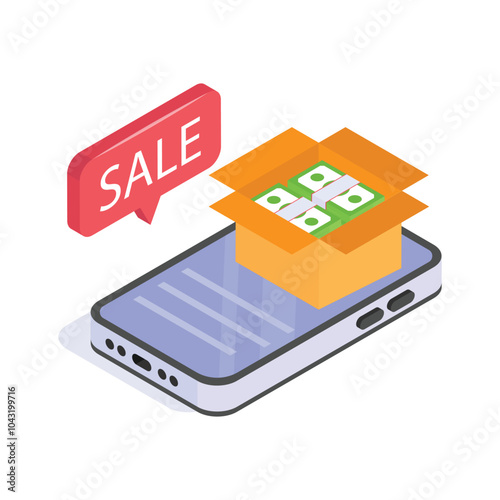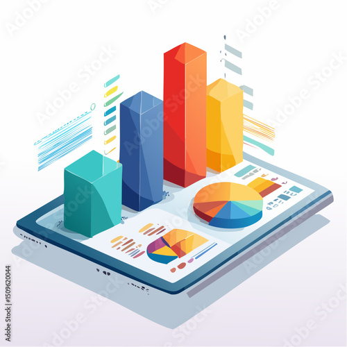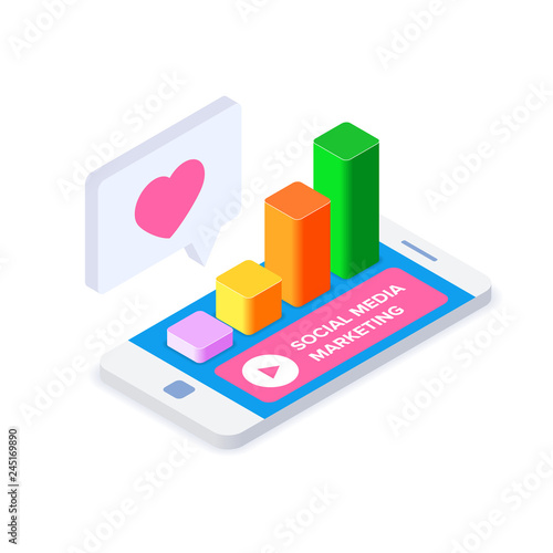 Smartphone s finančním sloupcovým grafem. Vektorová ilustrace obchodního a finančního konceptu v izometrickém stylu.