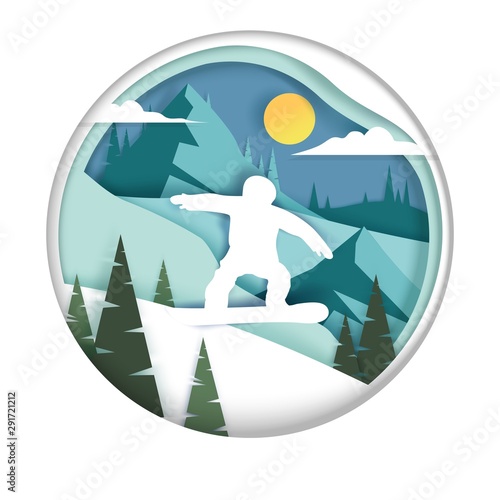 Snowboarding, vektorové ilustrace v papírové umění moderní řemeslné stylu. Papír řezané hory a snowboardista silueta jízda na snowboardu. Zimní sporty a rekreační aktivity.
