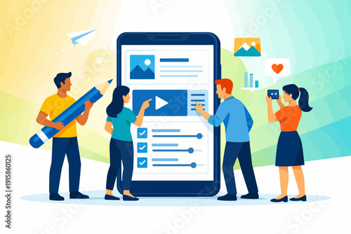 Vektorová ilustrace velkých chytrých telefonů a malých lidí, kteří sledují mobilní zařízení, získávají pozitivní zpětnou vazbu v sociálních sítích. Koncept komentářů na sociálních médiích pro webový banner, webovou stránku atd.