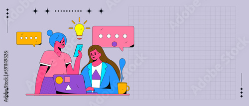 Koncept hashtag sociálních médií. Mladí lidé používají notebook a telefon pro odesílání zpráv, příspěvek v blogu a jejich sdílení v sociální síti. Vektor webové stránky šablony. Vstupní stránka webové stránky ilustrace.