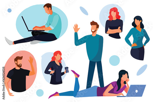 Mikro lidé sedí na obrovských palcích nahoru s notebookem, tablet, muž fotí mladou dívku, vektorová ilustrace. Marketing sociálních médií má rád koncept služeb pro webový banner, webovou stránku atd.