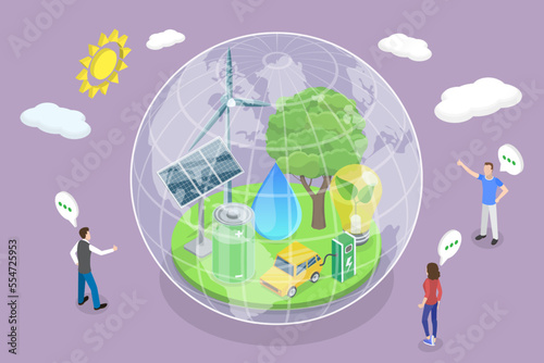 Solární panely, větrné turbíny, mužské a ženské postavy a zeměkoule, vektorový plochý design ilustrace. Obnovitelná zelená solární energie a koncept eco planet pro webový banner, webovou stránku atd.