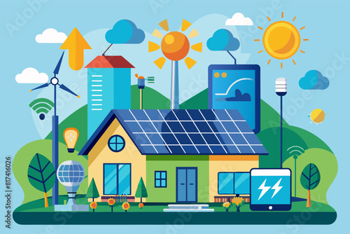 Vektorová plochá ilustrace výroby, skladování a spotřeby elektřiny. Ruční solární baterie, obytný dům se solárním panelem, zástrčka. Koncepce obnovitelných zdrojů energie a zelených technologií.