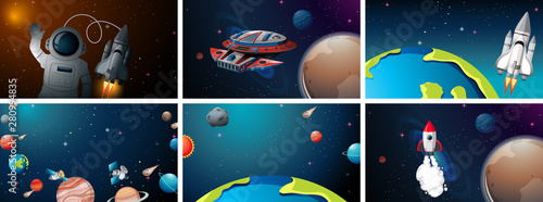 Sluneční soustava web banner šablony set. Vektorové realistické ilustrace. Slunce, Měsíc, Země a další planety sluneční soustavy, hvězdy, komety, souhvězdí. Space exploration innovation astronomy concept.