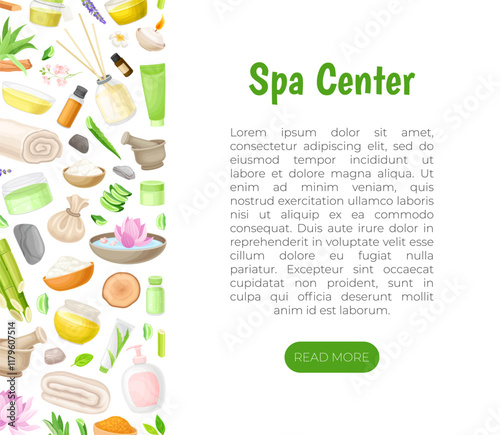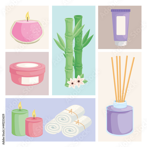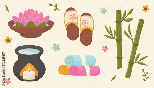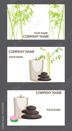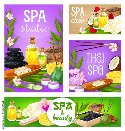 Spa vektorové banner šablony set. Realistické bambusové stonky s listy, solí, kameny, masážním olejem, aromatickými svíčkami a květinami. Spa beauty wellness pozvánka leták nebo reklamní plakát.