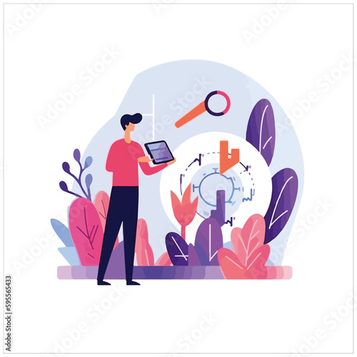 Mužské a ženské postavy připravující raketu a astronauta na vesmírné cestování, při pohledu dalekohledem, vektorový plochý design ilustrace. Průzkum vesmíru, start rakety, astronomická věda.