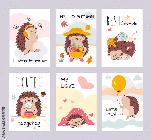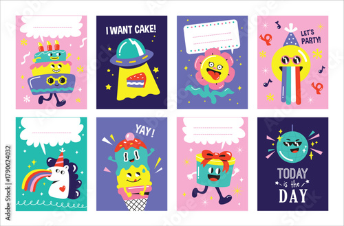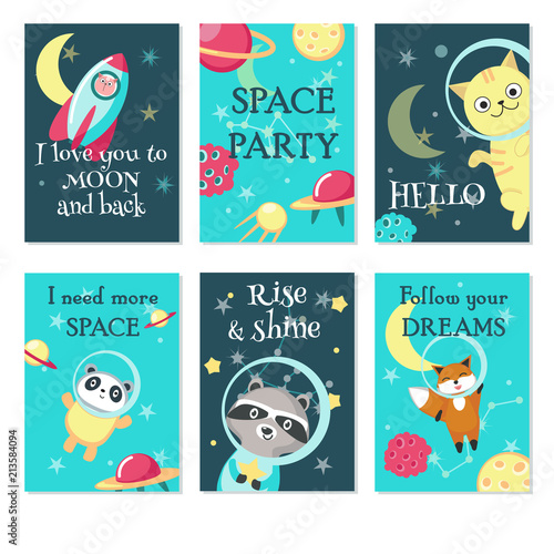 Sada šablon pozvánky na vesmírnou párty. Vektorové ilustrace roztomilých zvířat panda, mýval, liška, kočka ve vesmíru helma, rakety, planety, ufo, hvězdy, ručně psané citace.