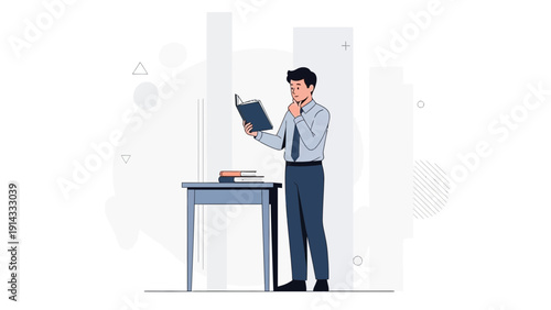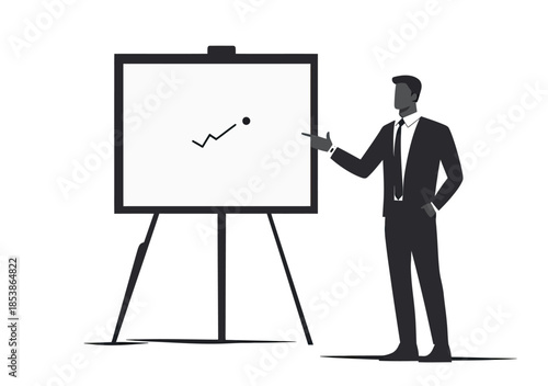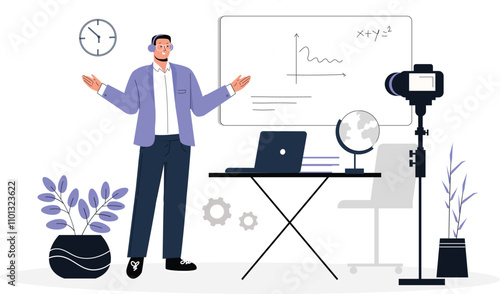 Vektorová ilustrace vědce, konstruktéra přednášejícího nebo přednášejícího. Průzkum vesmíru, vývoj letecké techniky, koncepce vzdělávání ve vesmírných vědách. Plochý design.