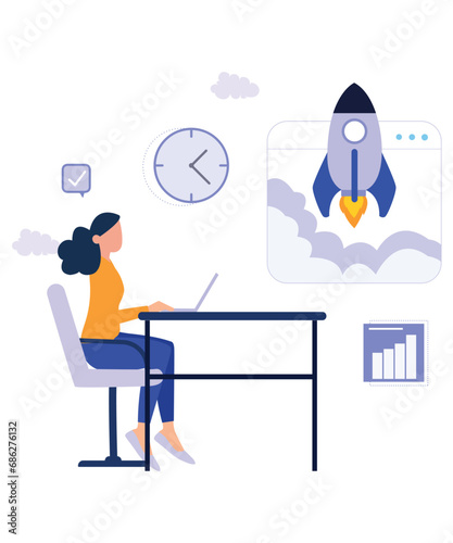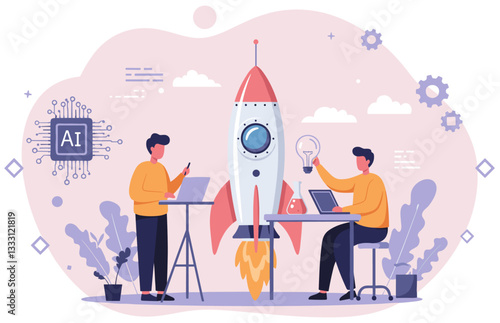 Vektorová ilustrace malých lidí inženýrů stavících velkou raketu, astronaut. Technologie průzkumu vesmíru, koncepce leteckého průmyslu pro webový banner, webovou stránku atd.