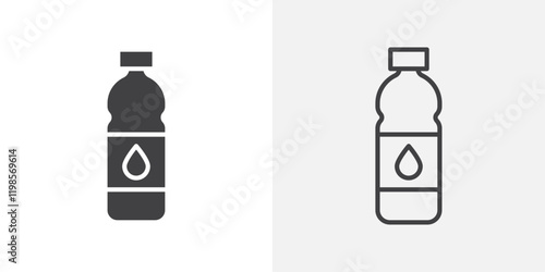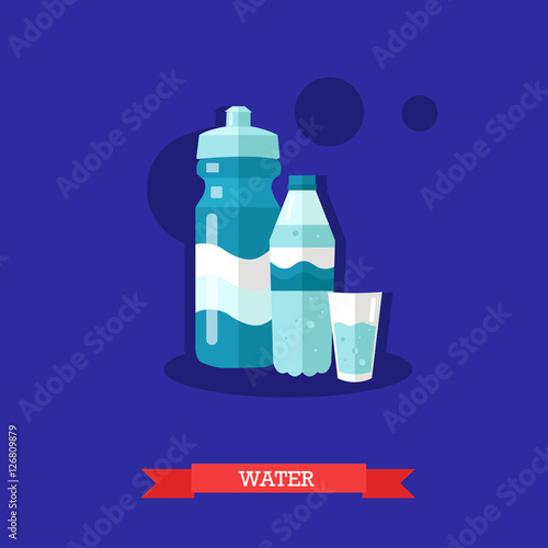 Vektorová ilustrace láhve minerální vody se sklem plným vody a sportovní láhve. Pitná voda je nejoblíbenějším nápojem pro zdravý životní styl. Plochý design