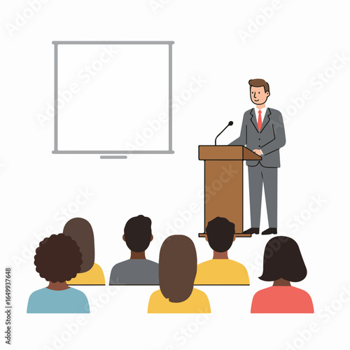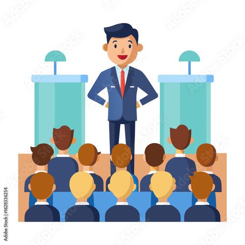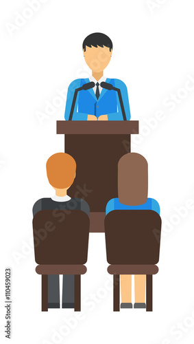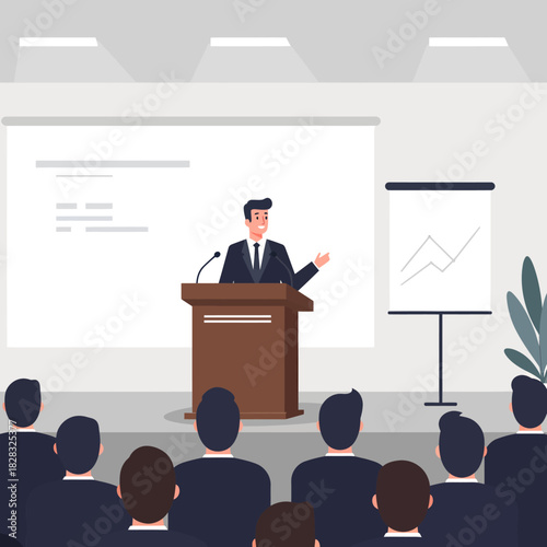 Řečník na pódiu stojící před publikem vektorové ilustrace. Řečník mluví z tribuny. Podnikatel dává řeč. Obchodní školení, koučování, prezentace investičních projektů
