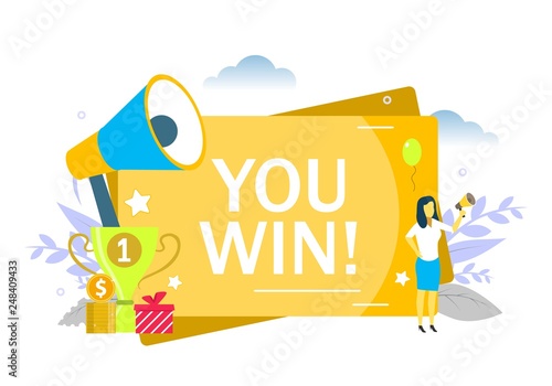 Speciální nabídka oznámení, žena mluví megafonem, dárkové krabičky, dolarové mince. Vektorové ploché ilustrace pro web banner, webové stránky atd. Speciální propagace slevy na prodej.