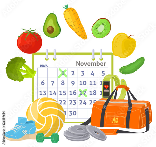 Sport a zdraví vektorové plakát. Datum kalendář plán tréninku, zdravá strava pro hubnutí a svaly, fitness věci a sportovní oblečení stavební ilustrace