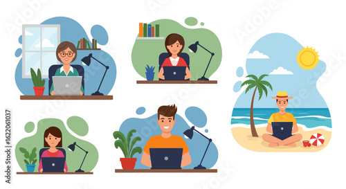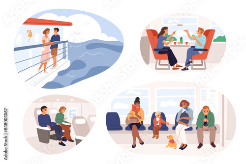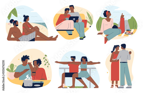 Sport fitness trenér vektorové scény. Profesionální sportovec, instruktor cvičení jógy, basketbalový a plavecký trenér izolovaná ilustrační sada. Podpora zdravého životního stylu