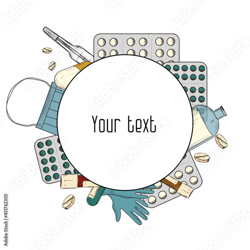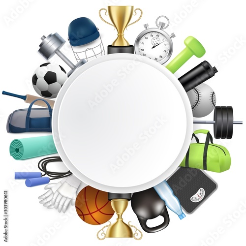 Sportovní kulatý rám, vektorové realistické ilustrace. Fitness tělocvična, fotbal, kriket, karta mistrovství basketbalových her, šablona štítku se sportovním vybavením a ochranným vybavením, kopírovací prostor.