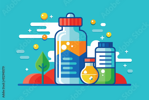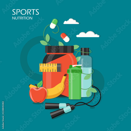 Vektorová ilustrace koncepce sportovní výživy. Syrovátkový protein, třepačka, banánové a jablečné ovoce, multi vitamínové kapsle. Plochý styl design prvek pro webové stránky šablony, plakát banner atd.