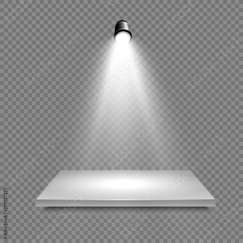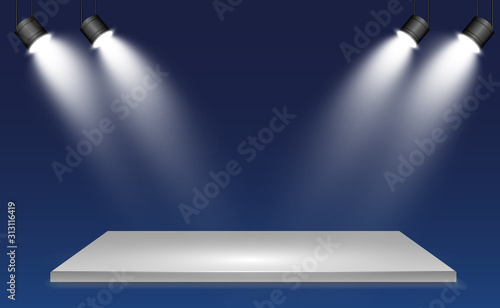 Police s reflektory, vektorové realistické ilustrace. Domácí osvětlení, stropní svítidlo s konceptem šesti bodových světel.