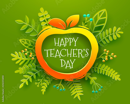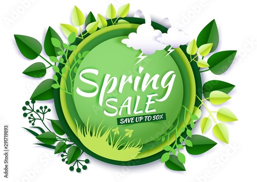Zelené listy dekorativní rám jarní prodej kreativní ruční písmo typografie, vektorové ilustrace v papírovém uměleckém řemeslném stylu. Sezónní jarní výprodej propagační banner, šablona plakátu.