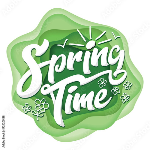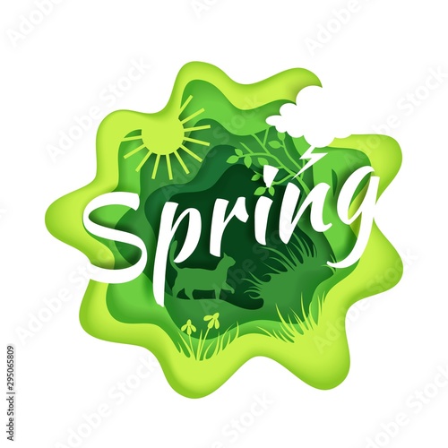 Jarní kreativní ruční písmo typografie, vektorové ilustrace v papírovém umění moderního řemeslného stylu. Složení jarní sezóny s papírem řezanou zelenou trávou, květinami, sluncem a siluetami koček.