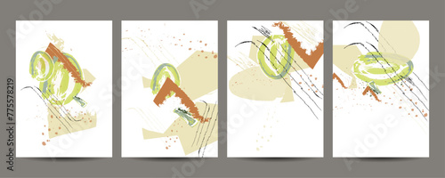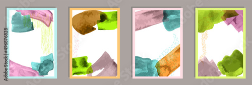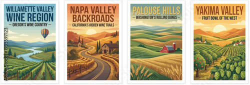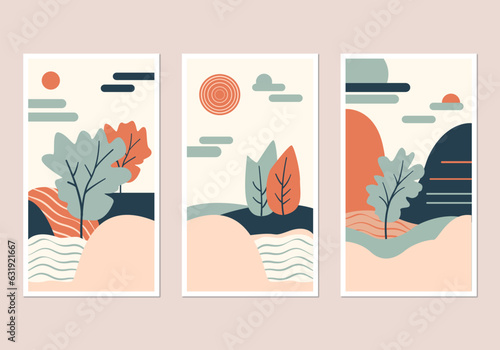 Jarní čas Vektorové ručně kreslené plakáty. Jarní sezóna ilustrace šťastného páru procházky v parku, venkovská krajina s farmou a větrným mlýnem a velký pták na větvi třešňového květu.