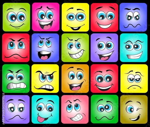 Square emoji vektorové ikony. Emotikon karikatura tvář úsměv. Zábavná znaková sada. Roztomilá geometrická ilustrace. Smiley obličeje avatar s šťastný emoce