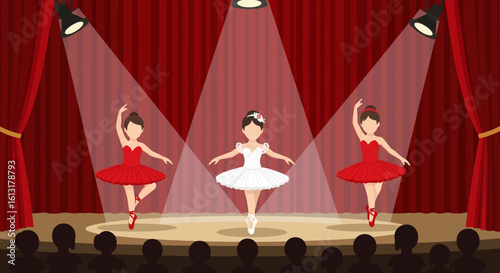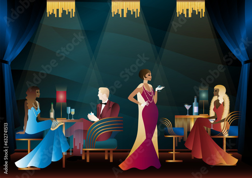 Stand up comedy show. Komička vyprávějící vtipné historky, vtipy před publikem na divadelní scéně, plochá vektorová ilustrace. Postavte se živé vystoupení, zábavná událost.