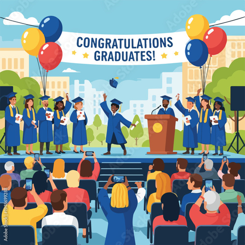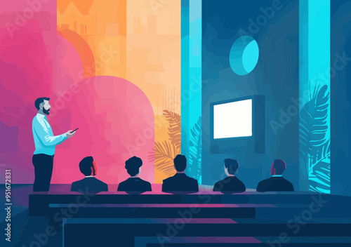 Stand up comedy show. Mužský komiks vyprávějící vtipné příběhy, vtipy před živým publikem, ploché vektorové ilustrace. Stand up komik kreslená postavička vystupující na divadelní scéně s mikrofonem.