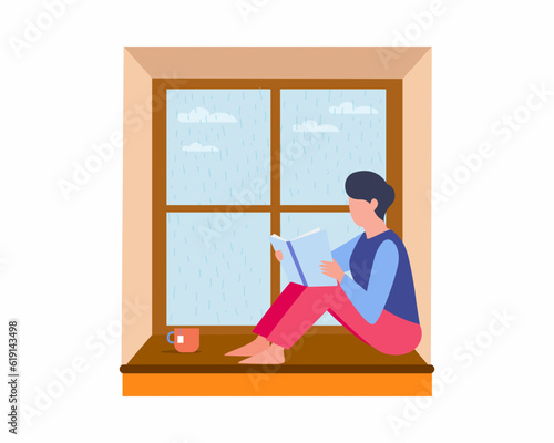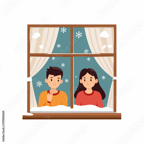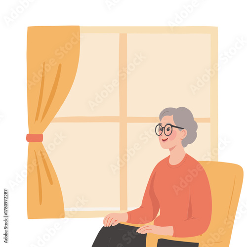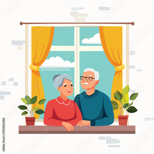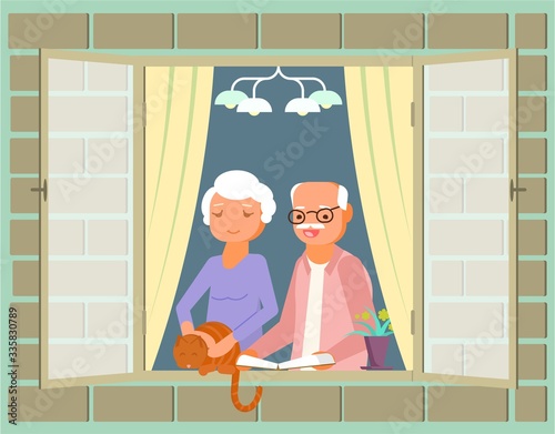 Starší pár stojící u okna, vektorové ploché ilustrace. Zůstaňte doma, karanténní preventivní opatření, abyste zůstali zdraví během pandemie viru corona. Nový virus prevence šíření nemocí COVID-19.