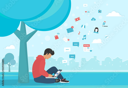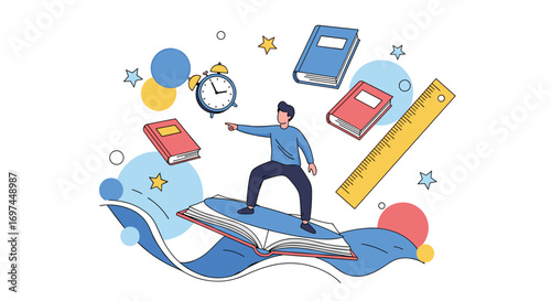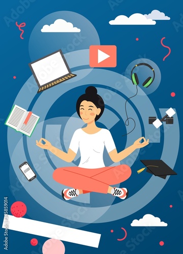 Zůstaňte doma vektorová šablona plakátu. Mladá dívka relaxační meditaci, zatímco sedí v pozici jógy. Mobil, notebook, sluchátka, kniha, činky, maturitní čepice kolem ní. Domácí karanténa, izolace
