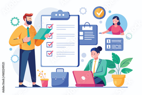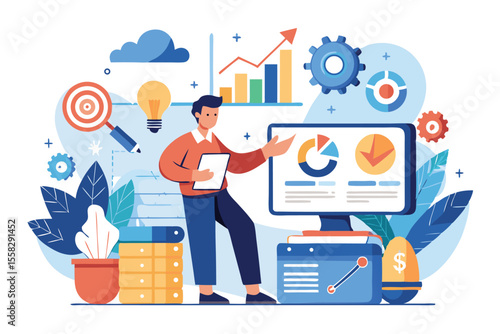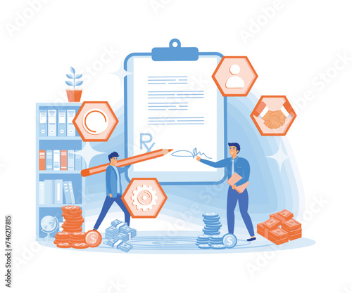 Akciový trh a obchodní koncept ploché vektorové ilustrace. Obrazovka počítače, deska s údaji o akciovém trhu a úspěšní podnikatelé šťastní obchodníci, zlaté mince.