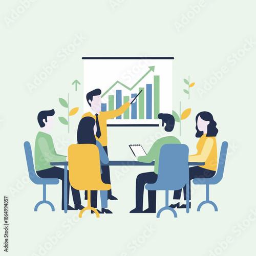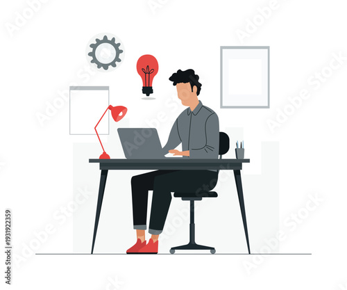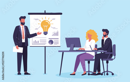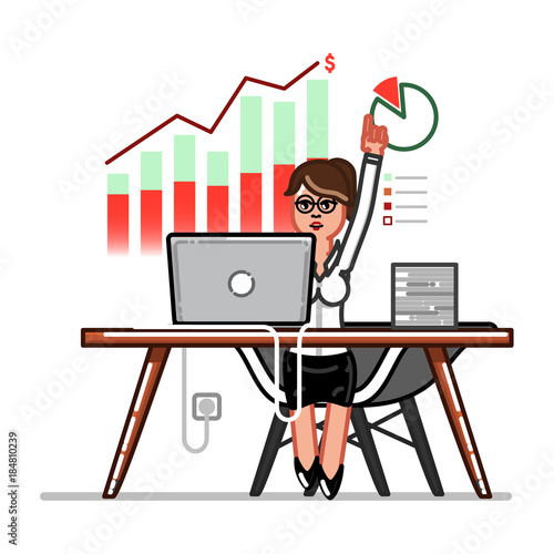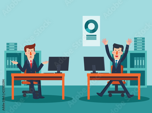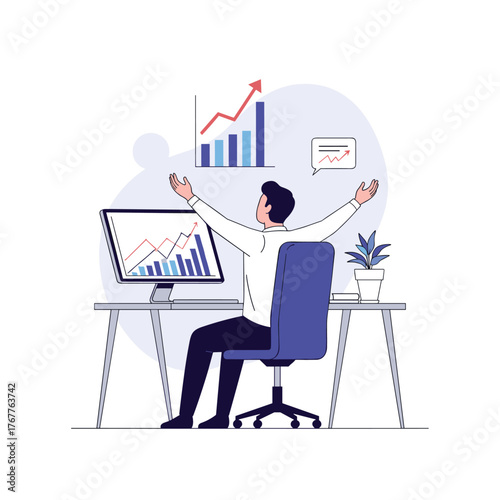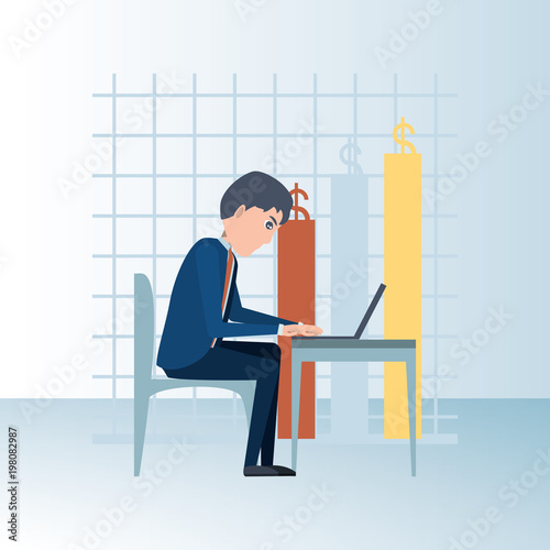 Akciový trh, investice a obchodování koncept vektorové ilustrace. Svícen graf a smutný podnikatel nešťastný obchodník při pohledu na monitoru počítače, zatímco sedí u stolu obchodníka.