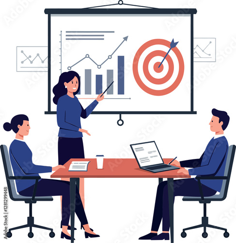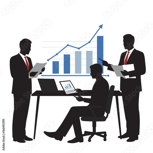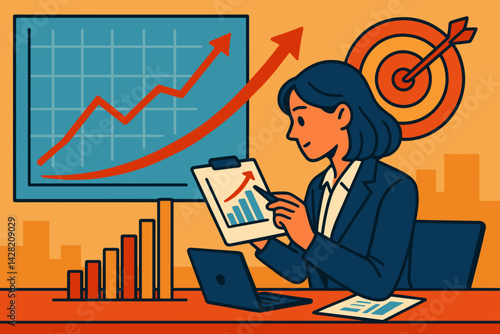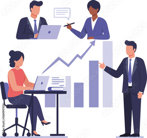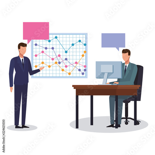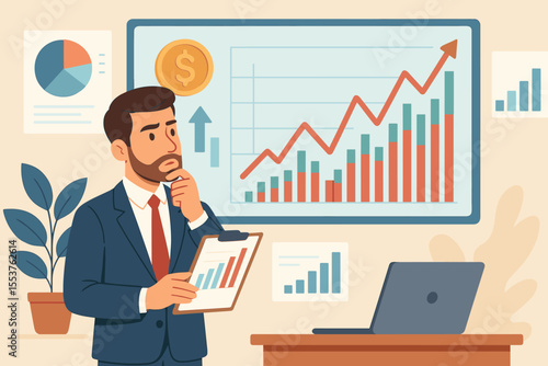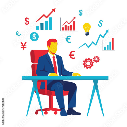 Akciový trh, investice a obchodování koncept vektorové ilustrace. Svícen graf a obchodník obchodník pracující u obchodníka stolu pomocí počítače.