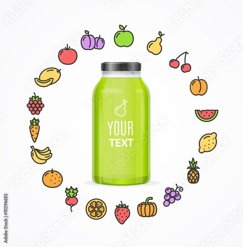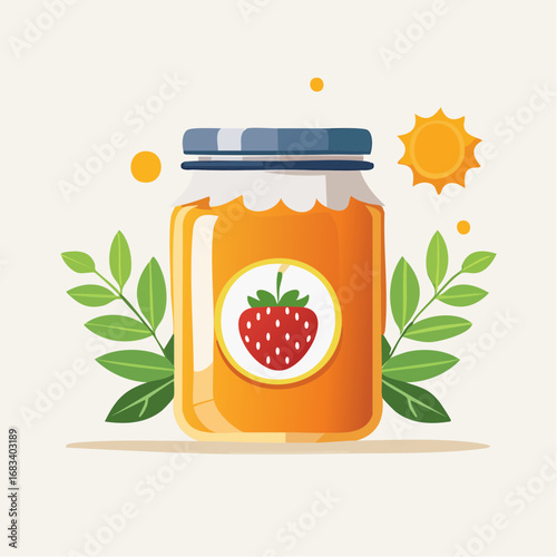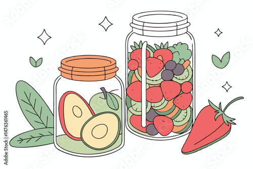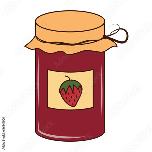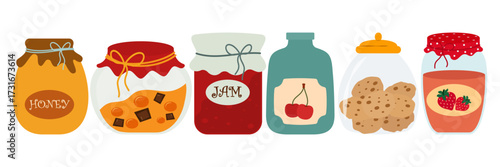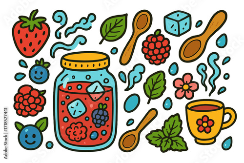 Reklamy na jahodový džem. Vektorové realistické jahodový džem skleněné nádoby a ručně tažené čerstvé jahody, třešeň, Malina, Borůvka, kopírovat prostor. Ovoce jam banner, plakát design šablony.